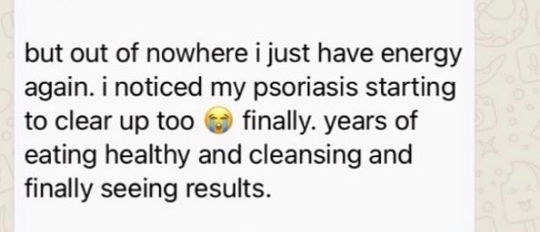 After 10 weeks:Â Better digestion, brain fog cleared up and skin glowing.